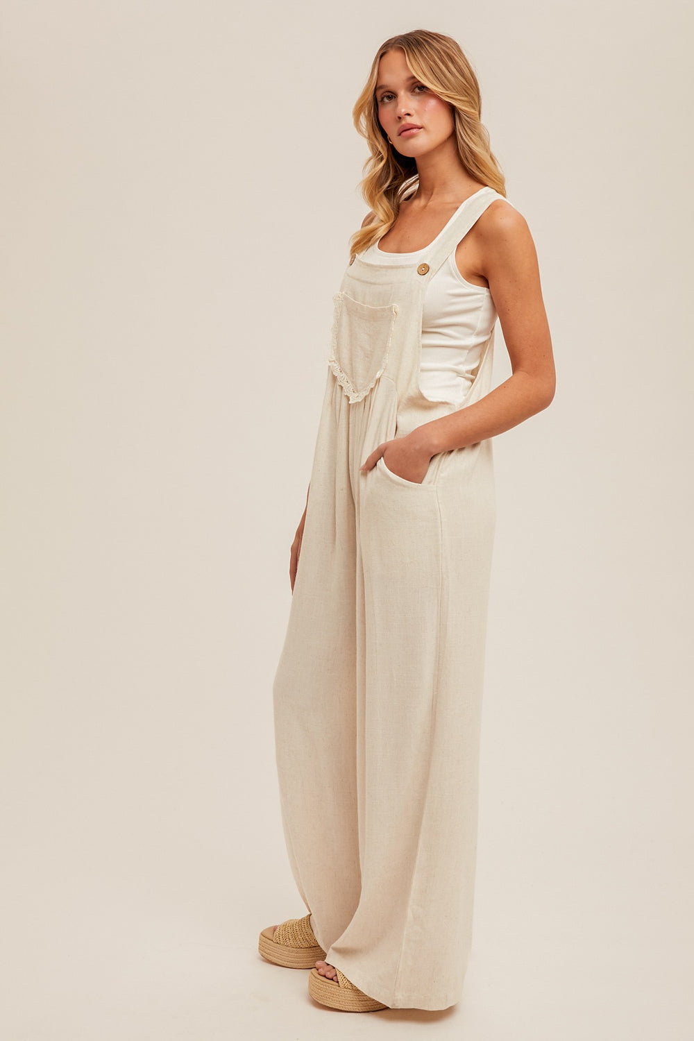 Softly structured with a touch of vintage charm, the Kaelie Overalls blend natural textures with feminine detail. Featuring breathable linen, a relaxed fit, and delicate crochet floral accents at the chest pocket, they offer a subtle nod to handcrafted design.