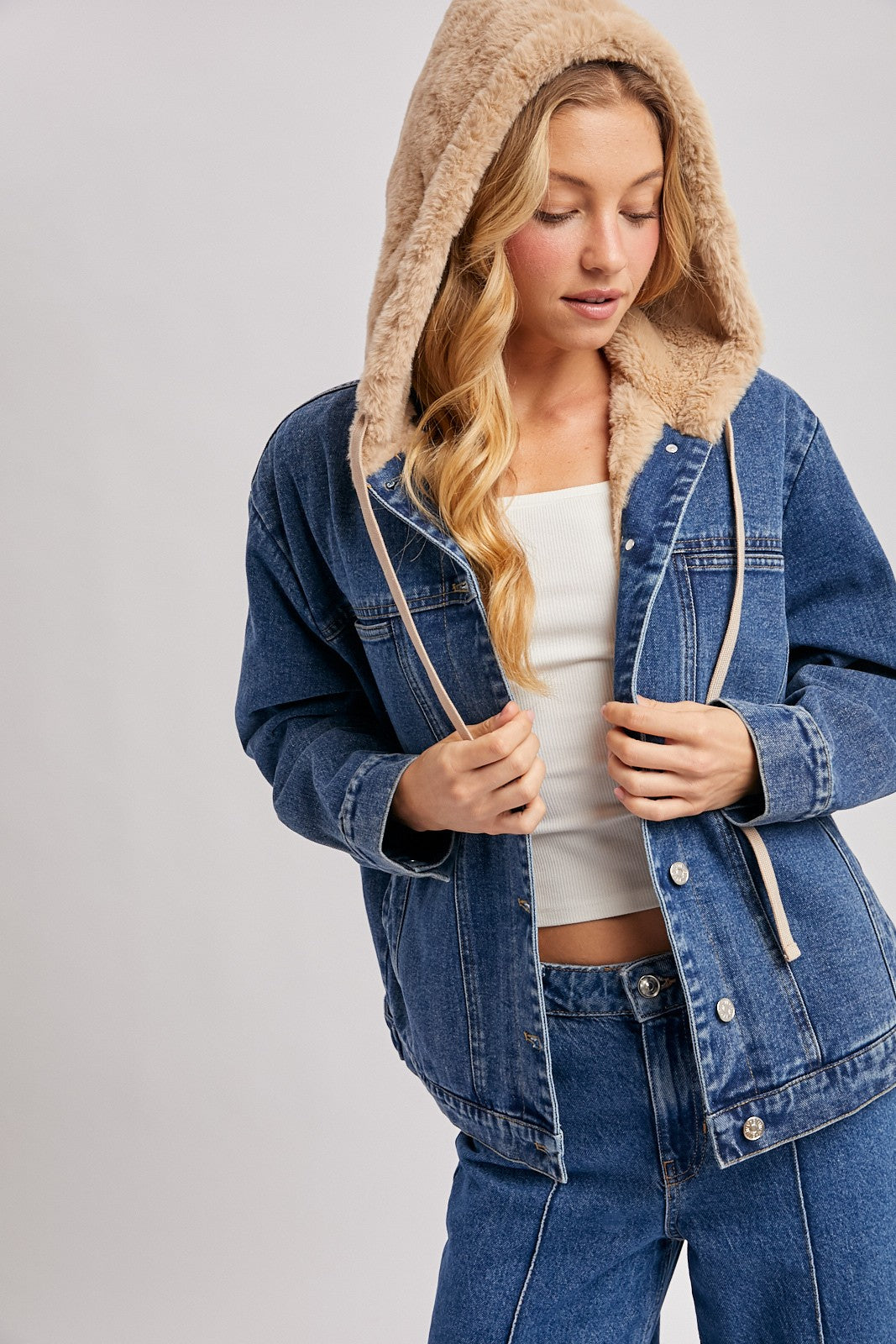 The Esther Button Down Faux Fur Denim Jacket pairs classic denim style with cozy, cold-weather comfort. Designed with a soft tan faux fur lining that extends into the hood, this jacket brings warmth and texture to an everyday staple. The structured denim exterior is balanced with plush contrast inside, making it an easy layer that feels both practical and elevated for fall and winter days.