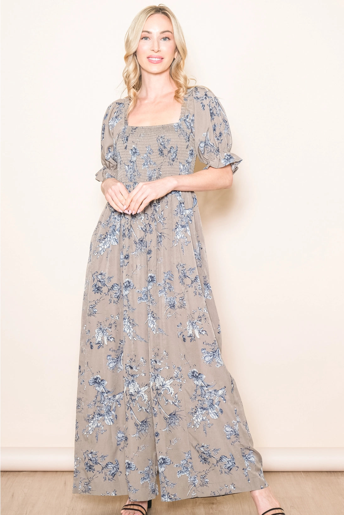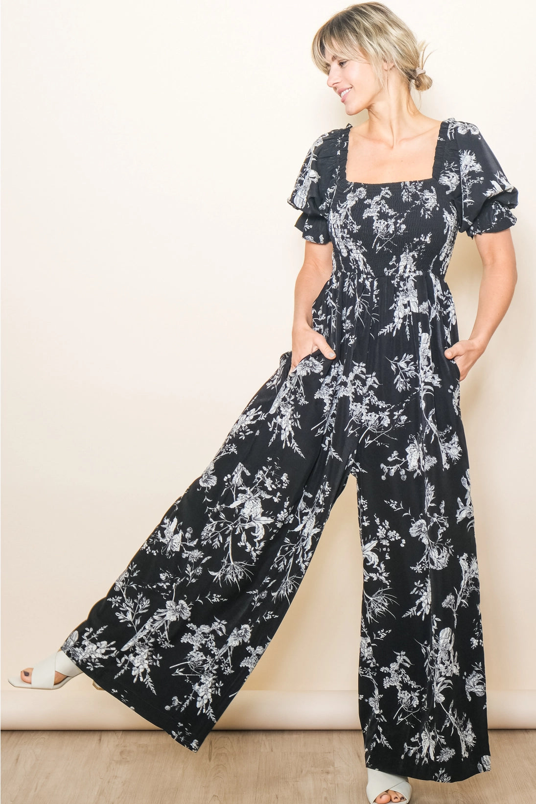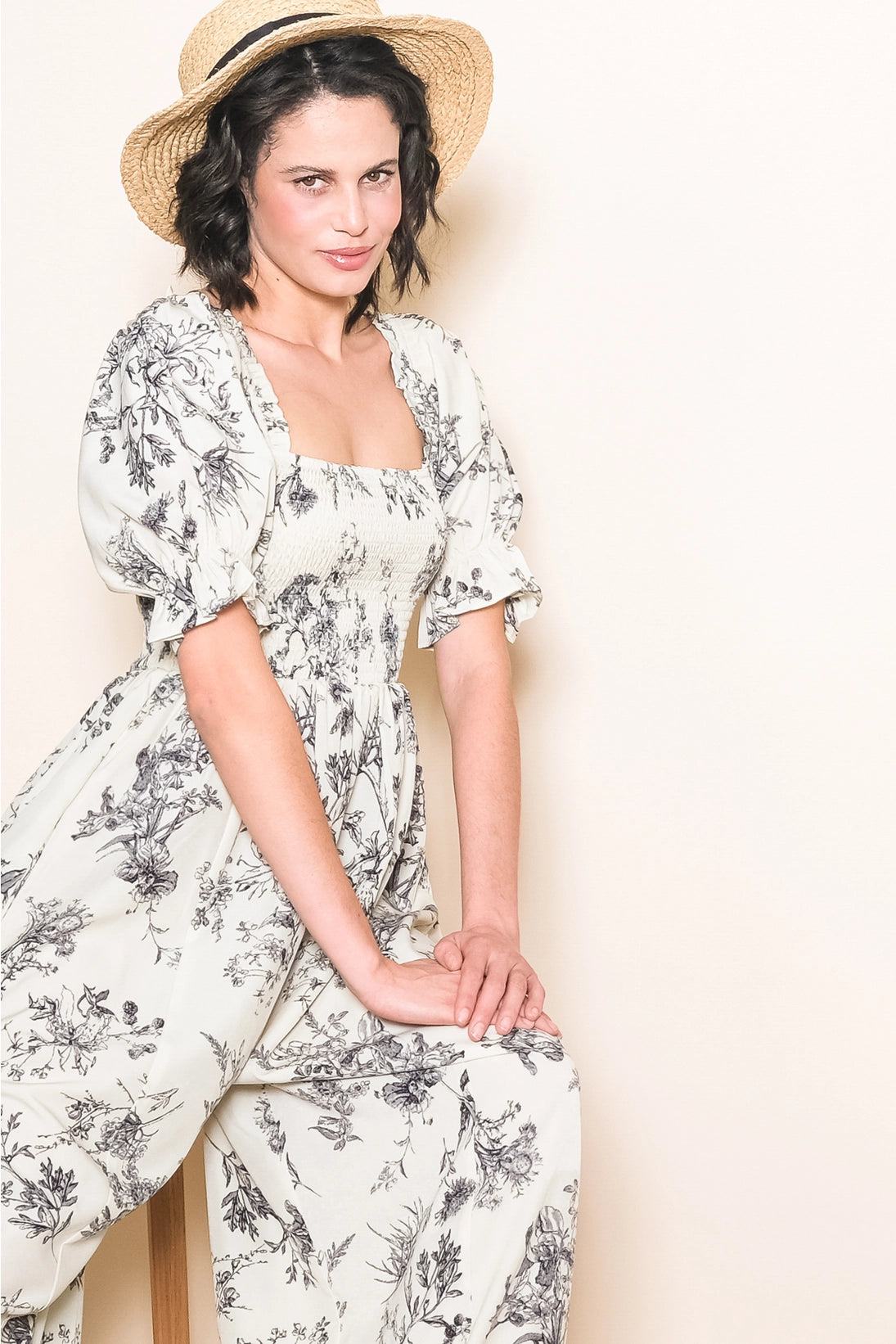 This women’s jumper brings easy elegance to a relaxed, wearable silhouette. Designed with a flattering square neckline, soft puff sleeves, and a smocked chest that moves comfortably with the body, it balances structure with softness beautifully. Extra-wide legs create a graceful, modern flow, while side pockets add everyday practicality. Finished in a vintage-inspired floral print with refined black, cream, and gray tones, this piece feels timeless, calm, and effortlessly styled.