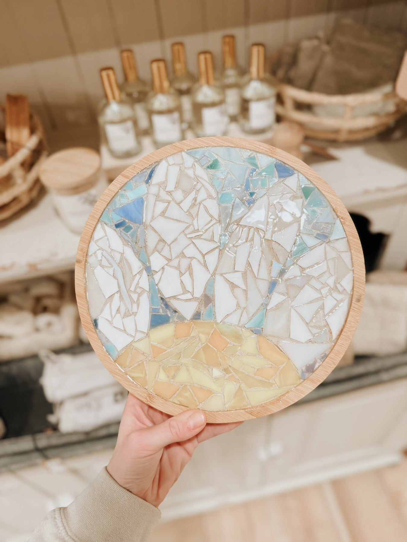 Turn an everyday household item into a beautiful piece of functional art in our Mosaic Lazy Susan Workshop. In this hands-on class, you’ll transform a 10-inch bamboo lazy susan into a striking centerpiece using stained glass and professional-grade Thinset mortar. Perfect for dining tables, kitchen islands, or entertaining spaces, this project blends creativity with practical design.